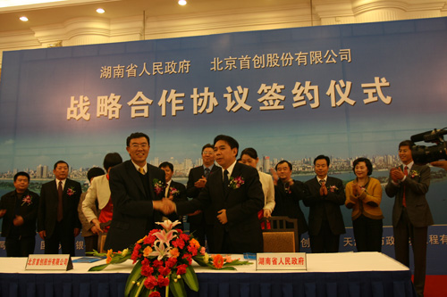 2007年12月21日,首创股份与湖南省人民政府《战略合作协议》签约仪式在长沙成功举行。首创股份董事长刘晓光在仪式上致辞并与湖南省省委常委、副省长徐宪平分别代表首创股份与湖南省人民政府签约。参加签约仪式的有国家开发银行、华北设计院的相关领导、湖南省相关职能厅局长、湖南省所有十四个州市常务副市长、副州长、首创股份副董事长曹桂杰、首创股份执行董事郑热力、首创股份总经理潘文堂、副总经理张恒杰、郭鹏以及CCTV、经济日报、湖南日报、湖南卫视、湖南电台等多家新闻媒体。