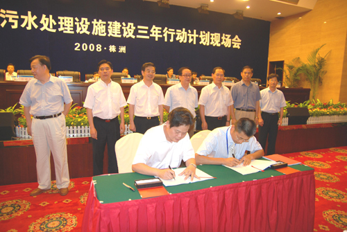 7月15日,“湖南省实施城镇污水处理设施建设三年行动计划现场会”在株洲市隆重召开,湖南省省委副书记、省长周强,省委常委、副省长徐宪平,省人大副主任萧亚瑜,省政协副主席阳宝华,省职能厅局长以及全省14个地市的主管副市长和92个县市的主要领导等三百多人参加现场会。首创集团副董事长、总经理刘晓光、首创集团董事郑热力、首创股份总经理潘文堂以及湖南首创公司总经理杨斌出席了会议。会上,作为积极推进湖南省污水处理设施建设的优秀企业代表,湖南首创与株洲市人民政府就“株洲市河西污水处理项目”举行签约仪式:河西污水处理厂规划日处理污水规模15万吨,其中一期规模8万吨、配套沿江截污干管49公里。首创股份潘文堂总经理与株洲市市长王群分别代表双方签署了管网BT合同,湖南首创杨斌总经理与株洲市建设局局长分别代表双方签署了污水处理厂BOT特许经营合同。根据合同约定:湖南首创将在未来两年内向株洲市投资3亿元人民币用于污水处理项目建设,同时株洲市所辖的株洲县、醴陵市、攸县、茶陵县、炎陵县的污水处理项目也将由湖南首创按照“统一规划、整体投资、流域管理”的原则、并作为全省污水处理设施建设工作又好又快推进的样板进行运作。湖南省周强省长、徐宪平副省长、株洲市市委书记等见证了签约仪式。