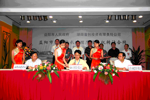 9月12日,湖南首创投资有限公司与益阳市人民政府在益阳市华天大酒店举行了“益阳市团洲污水处理厂”特许经营权转让签约仪式。益阳市委常委、副市长黄加忠,市人大、市政协等市领导及市政府各相关部门领导出席了仪式。湖南首创公司总经理杨斌与益阳市建设局、益阳市城市投资公司,分别代表双方签署了《团洲污水处理厂特许经营协议》等相关法律文件。团洲污水处理厂是益阳市的第一个大型城市污水处理厂,日处理能力10万吨/日,2004年12月建成并开始试运行,经过严格的招投标程序,湖南首创公司依法取得了该厂的资产经营权,经营权转让价格为12000万元人民币。特许经营协议签订后,湖南首创公司将组建益阳首创水务公司,具体负责团洲污水处理厂的运营管理,并以此为中心,积极参与益阳市所属各县市污水处理设施的投资、建设和营运工作。