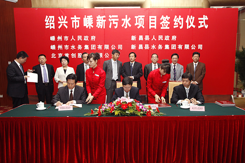 10月18日,在北京新大都饭店隆重举行了绍兴嵊新污水处理项目签约仪式。首创集团副总经理潘文堂,首创股份董事总经理俞昌建,首创股份董事副总经理张恒杰、首创股份董事常维柯,首创股份副总经理于丽、郭鹏、曹国宪等领导以及嵊州市人民政府赵祥军副市长、新昌县人民政府柴理明副县长、嵊州市水务集团罗川龙董事长、新昌县水务集团王晓明董事长等市县领导出席了签约仪式。俞昌建总经理代表首创股份与对方分别签署了《特许经营协议》、《增资扩股协议》、《合资经营合同》,协议约定:嵊新污水处理厂规模为日处理污水15万吨,远期为30万吨,出水水质执行《城镇污水处理厂污染物排放标准》中的一级B标准,首创投资总额为1.29亿元,占股比例为51%。本项目签约后,首创股份在浙江省将拥有两座污水厂、共计25万吨/日的污水处理能力,该项目的签约进一步扩大了首创在浙江省污水市场的占有率,对公司实现区域产业布局具有积极意义。