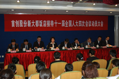 2月25日,新大都饭店在国际会议中心一层报告厅召开了“接待十一届全国人大四次会议动员大会”。首创集团副总经理潘文堂、首创股份总经理俞昌建、副总经理于丽等应邀到会,新大都饭店领导、各部门经理和员工代表120余人参加了会议。会上,新大都饭店总经理李国良做了动员报告并与饭店各部门经理签订了《接待十一届全国人大四次会议安全服务责任书》。首创股份副总经理于丽在讲话中指出接待要在细节服务上下工夫。首创集团副总经理潘文堂强调此次“两会”召开在“十二五”的开局之年,维稳工作压力较大,要求饭店全体用心服务,满足代表所需。