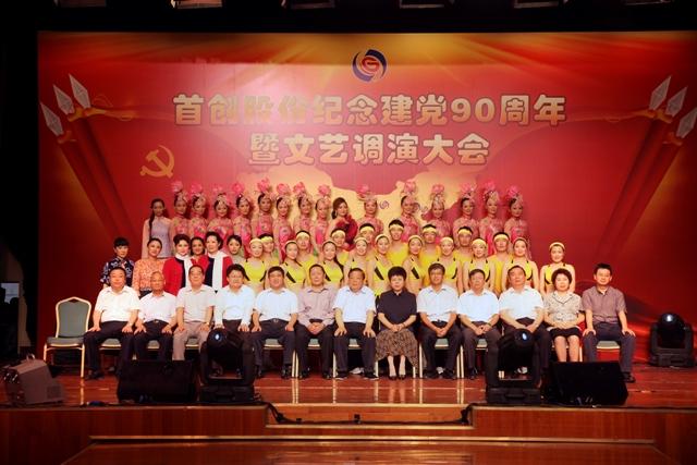 首创股份纪念建党90周年暨文艺调演大会于2011年6月10日14点在新大都饭店国际会议厅顺利召开。首创股份系统各单位参会代表共聚一堂,隆重纪念中国共产党建党90周年。大会分为两个阶段,第一阶段纪念建党90周年部分,由首创股份党委副书记、总经理俞昌建同志主持。首创股份党委书记张恒杰同志宣读《中共北京首创股份有限公司委员会关于表彰先进基层党组织、优秀共产党员、优秀党务工作者的决定》,并代表公司党委号召各级党组织向受表彰的先进基层党组织、优秀党员、优秀党务工作者学习。大会还举行了新党员宣誓仪式,由党群工作部主任薄祥军同志领誓,9名新入党同志面对党旗郑重宣誓。最后集团党委副书记、副董事长曹桂杰同志代表集团党委发表重要讲话,她首先代表集团党委向受到表彰的组织和同志表示热烈祝贺,向新党员提出期望;同时对用首创股份LOGO贴纸粘在中国地图大背板上“占领阵地”这种特殊的签到方式有感而发,回顾了首创股份的成长历程,展望了首创股份未来的美好前景。大会第二阶段的文艺调演部分,在首创爱华《再唱山歌给党听》的优美动人的藏族歌舞中拉开序幕。此次文艺调演大会17个单位19个节目,很多都在当地获奖。歌伴舞《绣红旗》、男女二重唱《珊瑚颂》、诗朗诵《青春中国》等节目以不同的艺术形式讴歌了党的光辉历程,表达了首创人对伟大的党90岁华诞的祝福;越剧《十八相送》、《古丈茶歌》、土家歌舞《黄四姐》、歌伴舞《万泉河水》、《我的家乡飞出一支歌》、《洪湖水浪打浪》等充满地方特色的文艺节目表达了各水司员工热爱家乡、建设家乡的美好心愿;快板《赞首创》、诗朗诵《党啊,请您听我说》等节目展现了首创人在各方面取得的丰硕成果。整个演出内容丰富、气势恢弘,贯穿着昂扬的时代主旋律和对党的忠诚、热爱之情,引起了现场观众的强烈共鸣。最后,全体与会人员同声高唱《首创之歌》,大会在雄壮激昂的歌声中圆满落下帷幕。