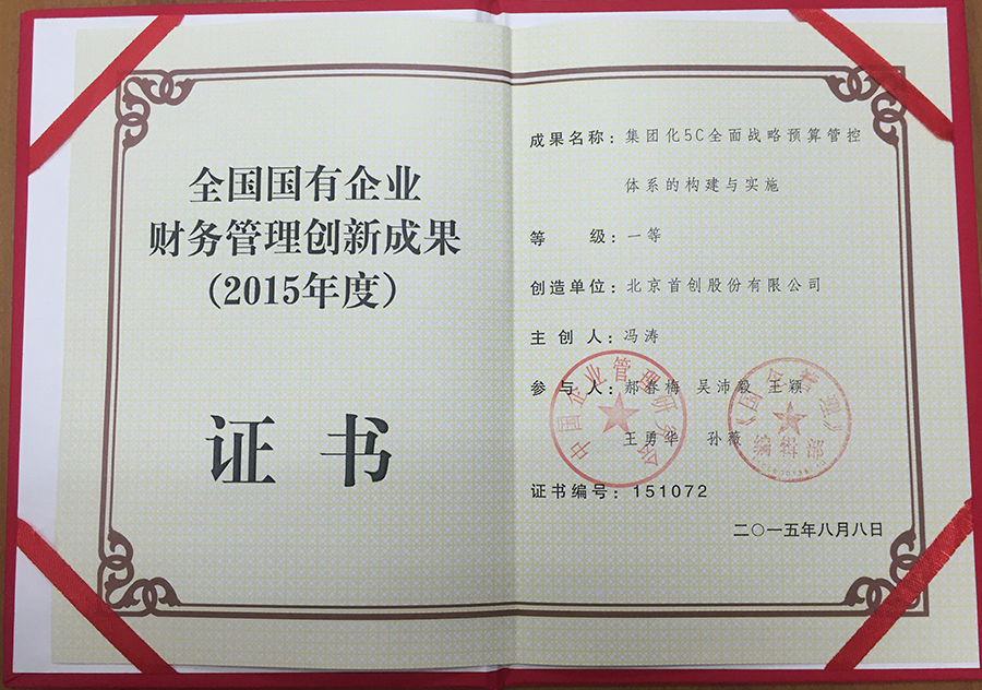 此次会议还发布了2015年首届全国国有企业财务管理创新成果和优秀论文名单。首创股份参评的《集团化5C全面战略预算管控体系的构建与实施》获得创新成果一等奖、《以现金池管控体系为核心的集团化资金管理》获得优秀论文二等奖。