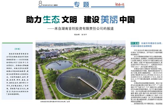 【引言】湖南首创投资有限责任公司是由湖南省政府引进的战略投资者——北京首创股份有限公司于2008年2月全资设立,在湖南从事城镇供排水、垃圾无害化处理等城镇公用基础设施投资、建设与运营管理的大型国有企业。目前布局株洲、益阳、常德、张家界、邵阳、娄底、岳湘西自治州、衡阳等9个市州,并以湖南为大本营,扩展至湖北荆州、恩施、黄冈、黄石,广东揭阳、陆丰、茂名等地,管理资产逾50亿元,拥有20多座污水处理项目和7座垃圾填埋场。